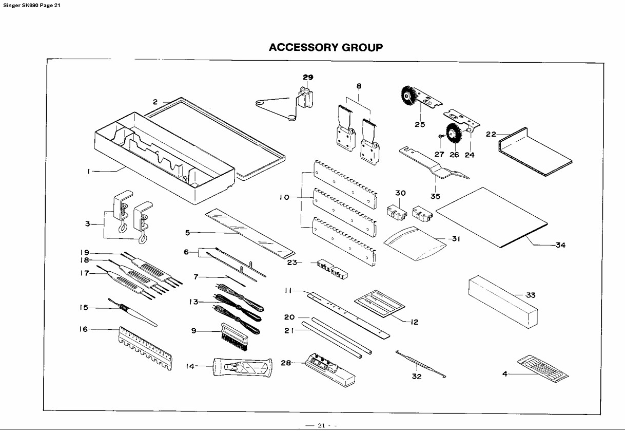 12473377 Accessories Complete No 1-33. Item Page no.21 Singer SK890 knitting machine.