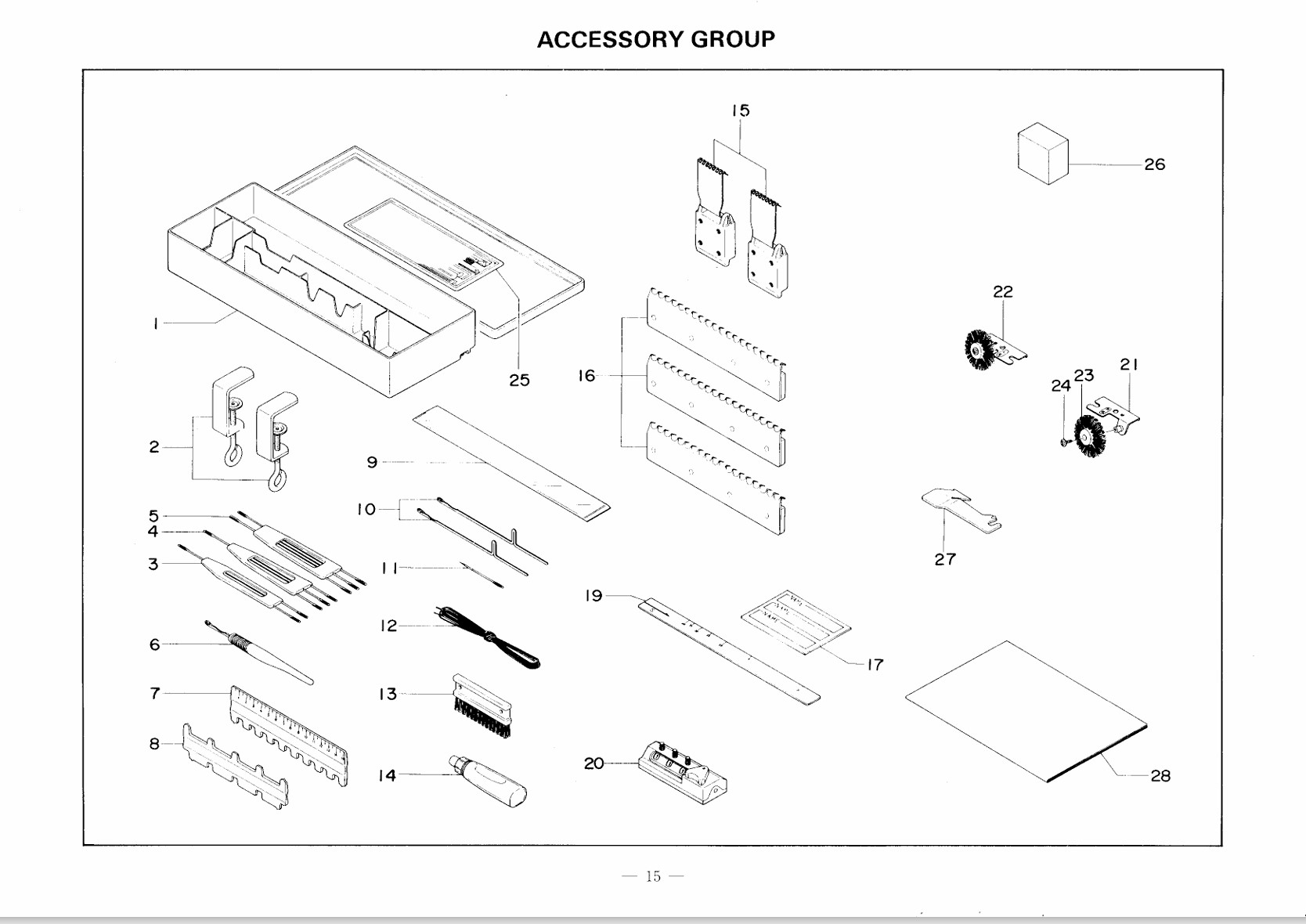 7406838 Accessories Complete (One to Twenty-Six Including Crochet Hook). Item Accessories Page 15. Singer SK151 Knitting machine.